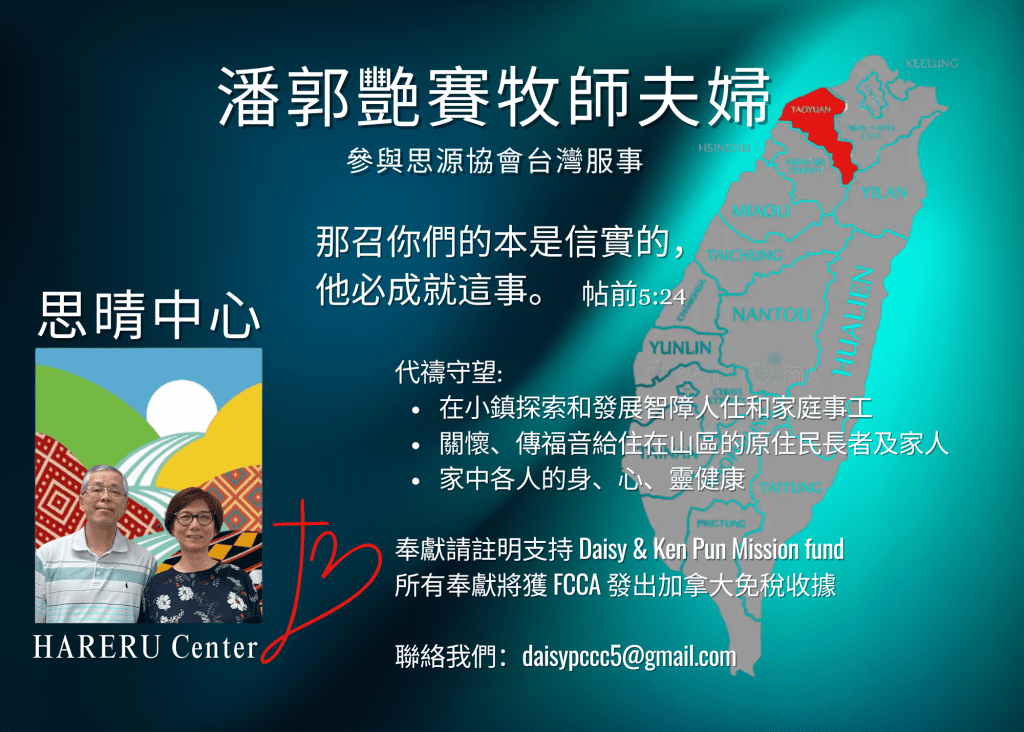今年九月,潘牧師夫婦將參與思源協會,前往台灣服事當地山區民族,計劃為期三年。